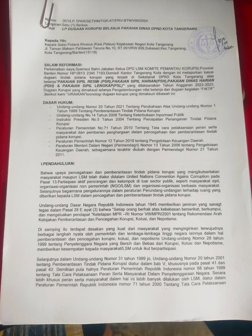 “saya meminta dan berharap kepada pihak Kejari Kota Tangerang LP dugaan korupsi Sekretaris DPRD Kota Tangerang tanggal 17 September 2024 kemarin,segera ditindak lanjuti”ucap Syamsul Bahri ke sejumlah Awak Media di kantornya Kota Tangerang Provinsi Banten.