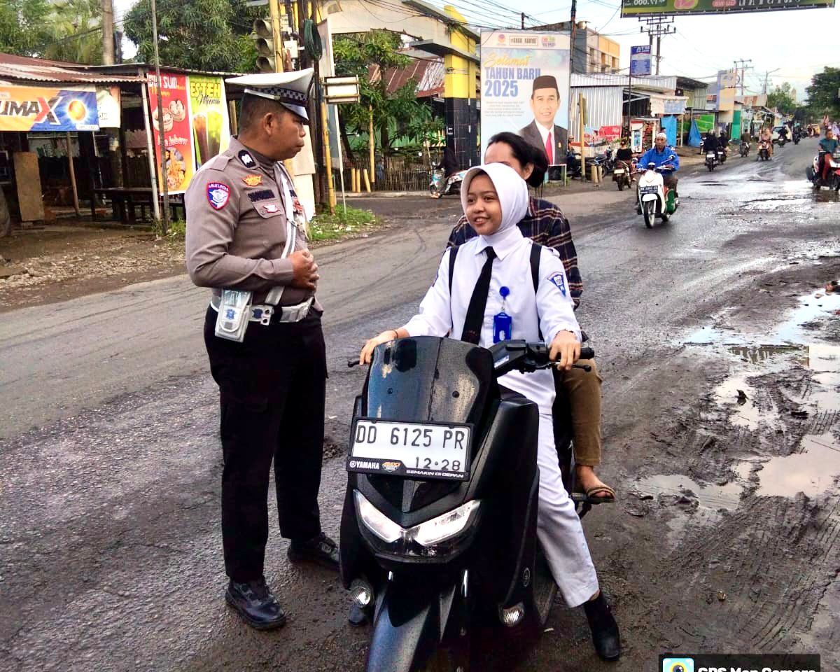 Hal ini terlihat saat AIPTU Saparuddin, salah satu anggota Sat Lantas, memberikan teguran kepada seorang pengendara sepeda motor yang kedapatan tidak memakai helm saat melintas.