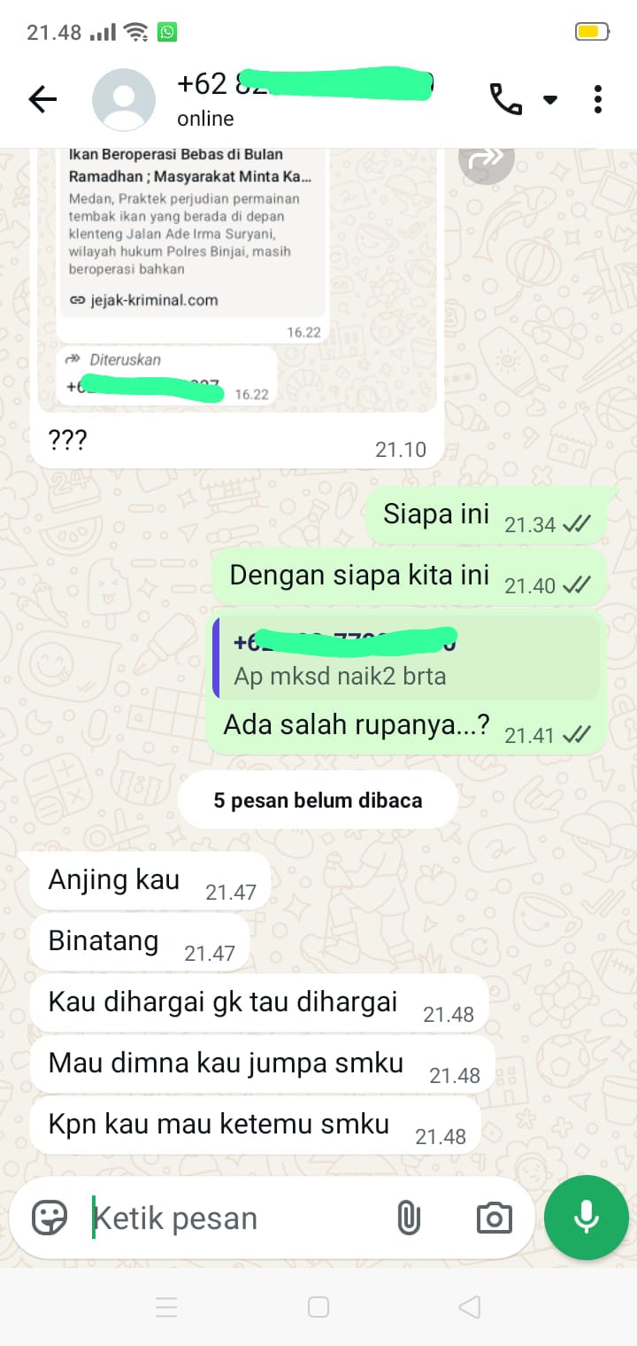 Pimpinan redaksi Tuntaspostv.com mengaku terkejut karena pesan yang bersifat konfirmasi kepada Kapolres Binjai tersebut bisa sampai kepada pihak lain yang disebut-sebut berada di lokasi perjudian tersebut.